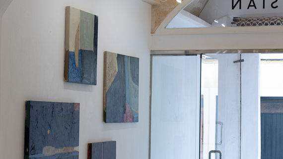 Sara Marlowe Hall's paintings are all based on landscapes in Menorca. The paintings have linear lines and blocks of color that reference the countryside and deep blues of the Balearic Sea. Her plaster paintings reference the soil, plants, red rocks, blue sea and rusty sand. Her daily routine of going to different beaches influence the paintings, depending on the long countryside roads, forest sand beaches, or rock slab plunge pools. Each painting creates a new landscape, through the painters' eyes. The titles give reference to specific settings, forming a direct link to the special bond formed between the artist and the island.